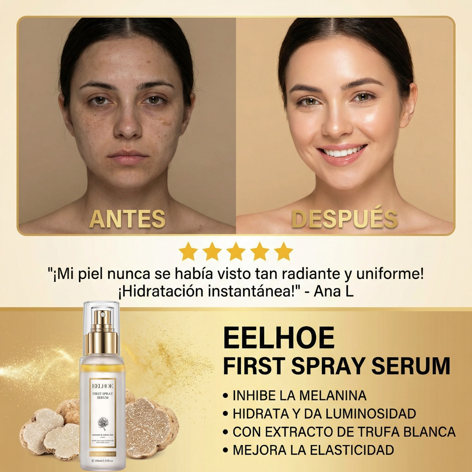 Descubre la bruma facial que tu piel estaba esperando. Con extracto de trufa blanca y activos hidratantes, EELHOE hidrata, revitaliza y aporta luminosidad inmediata. Perfecta para todo tipo de piel, incluso las más sensibles.